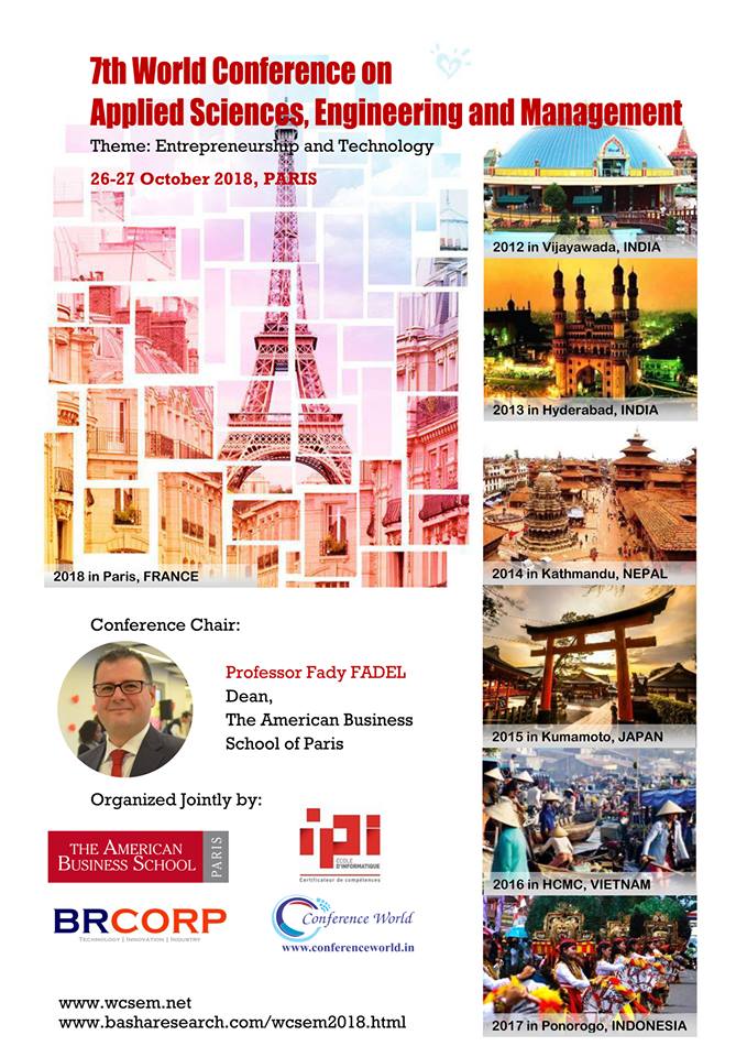 Seventh WCSEM is organized jointly by IPI Engineering School France, Basha Research Corporation and Conference World. The theme for this year is Entrepreneurship and Technology.