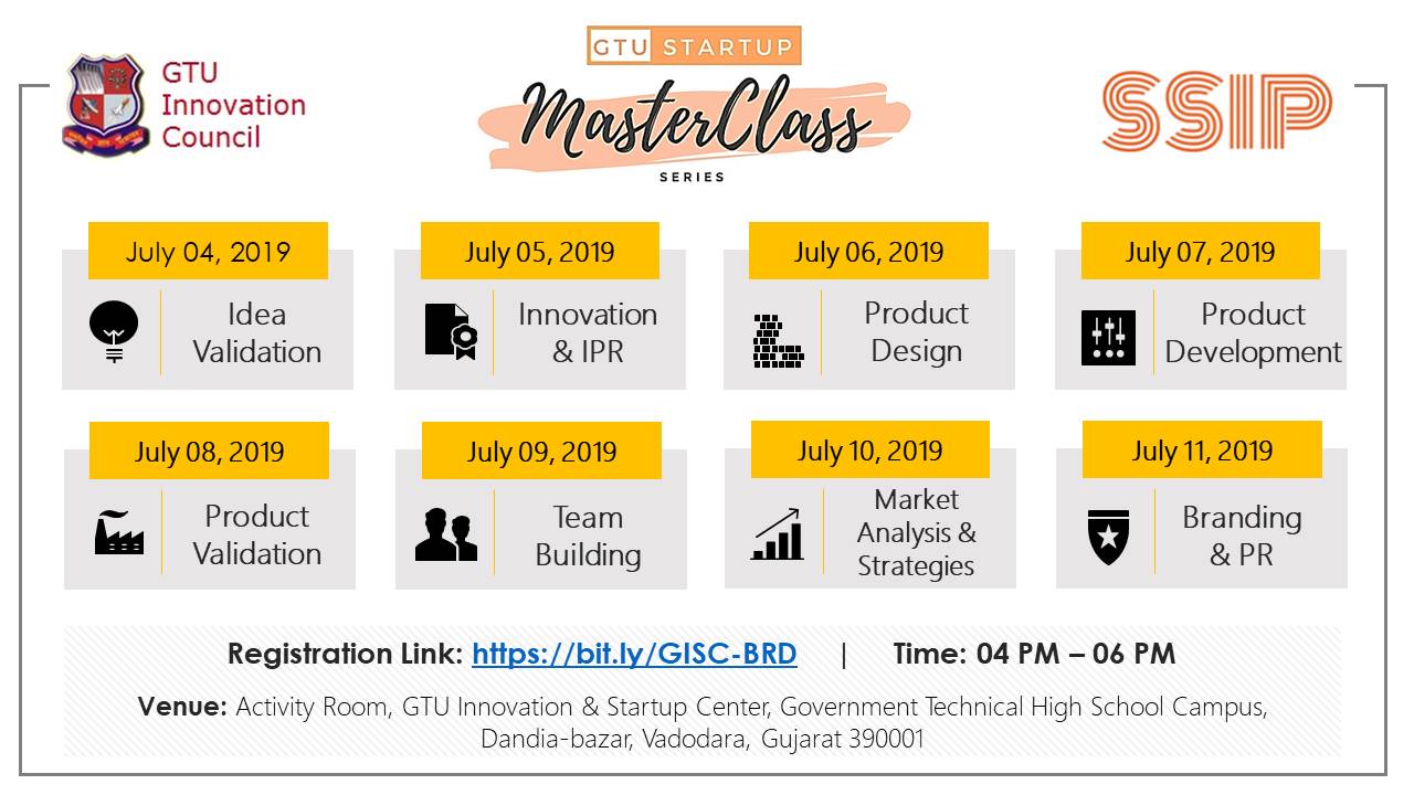 Venue:  Activity Room, GTU Innovation & Startup Center (GISC), Government Technical High School Campus, Near Aurobindu Ashram, Dandiabazar, Vadodara – 390001