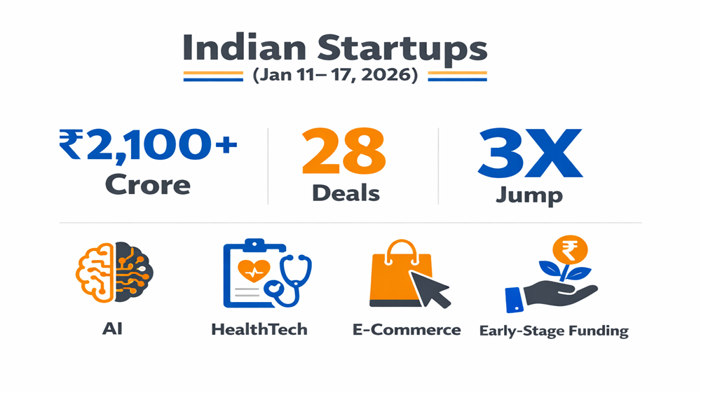 Between January 11–17, 2026, Indian StartUps secured roughly Rs. 2,100–2,250 crore in funding (about 254–269 million dollars) across 28 disclosed deals, marking a sharp 3–3.4X rise over the previous week. Seed and Series A dominated volume with at least 14 rounds, confirming that early-stage capital is back in play even as late-stage cheques remain selective.