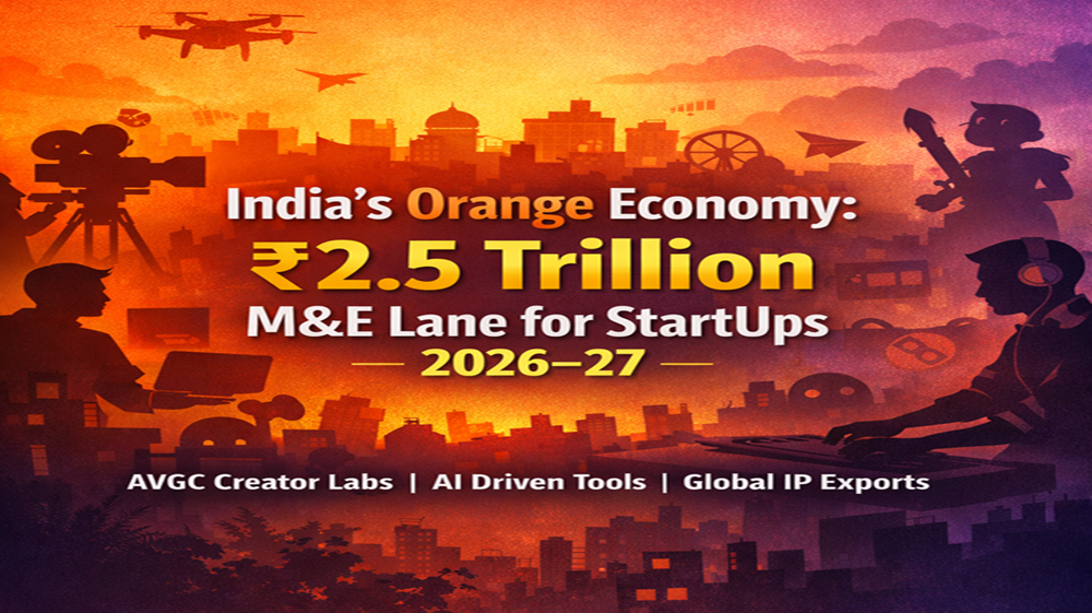 India’s Orange Economy, highlighted in Budget 2026–27, is the creative and knowledge-driven segment focused on animation, gaming, VFX, and digital content, projected to need 2 million skilled professionals by 2030 and linked to a Rs. 2.5 trillion M&E ecosystem; StartUps can leverage AVGC-creator labs, AI-driven tools, and India’s $11 billion-plus creative exports to build globally scalable IP and platforms.