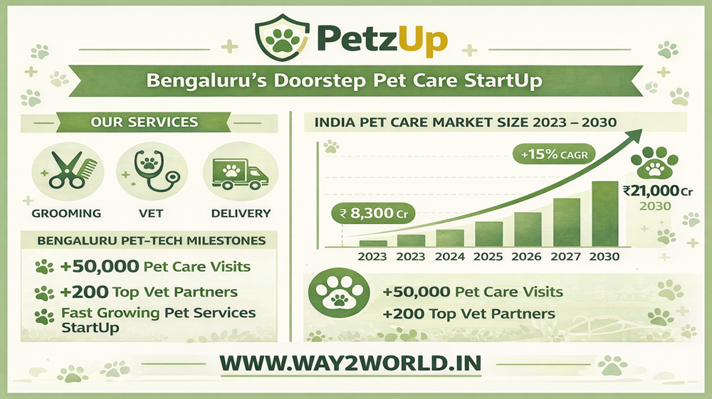 PetzUp is a Bengaluru-based pet care StartUp that offers doorstep grooming, vet consultations, walking, and home delivery of pet products, targeting India’s fast-growing pet care market projected at about 6,250 crore rupees by 2030, and serving urban pet parents who want convenient, trusted services at home.