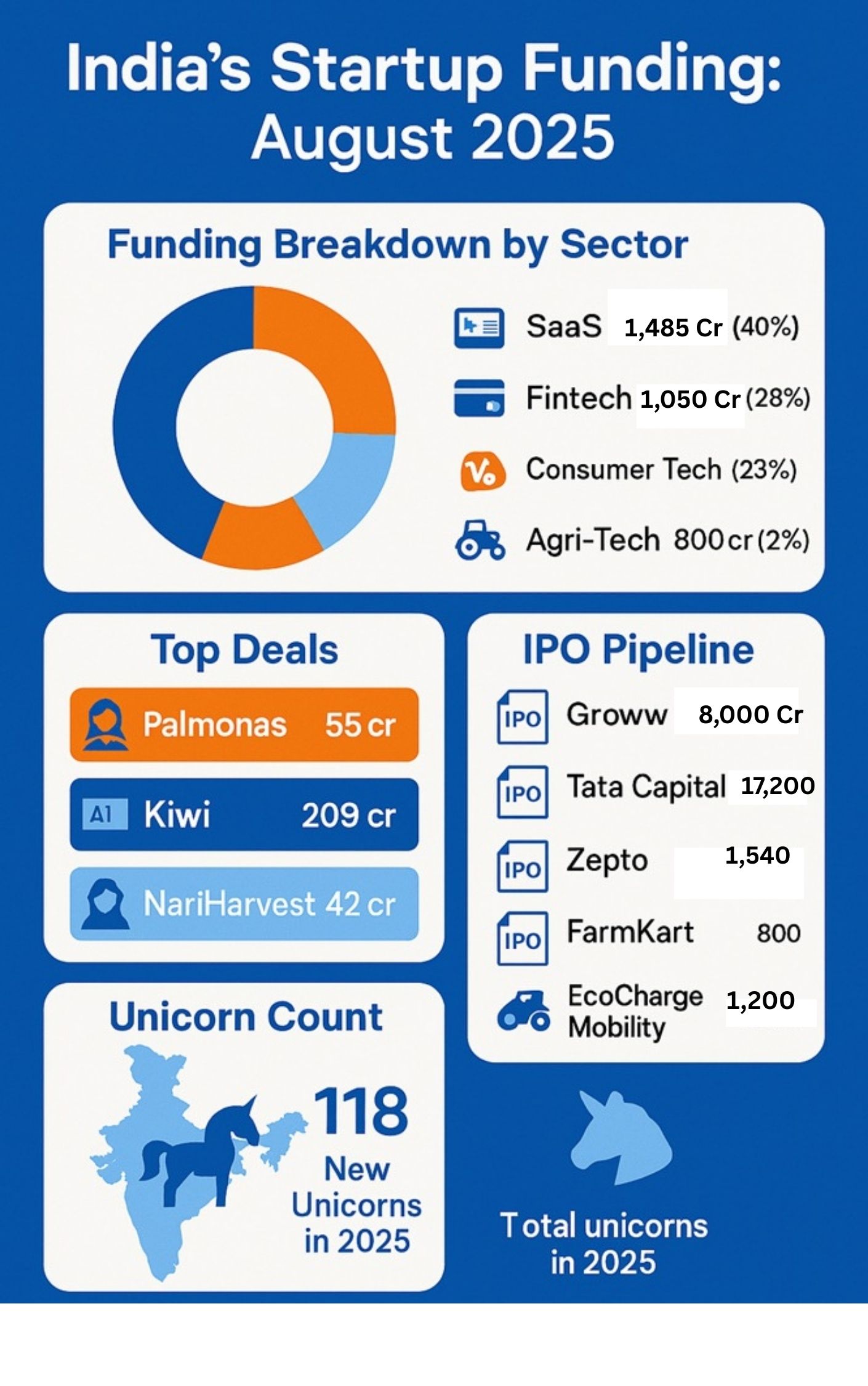 Key Deals & Company Spotlights: Top deals include Palmonas (?55 crore), Kiwi ($24 million), and women-led NariHarvest ($12M seed round). OYO’s potential $7-8 billion IPO and Molbio Diagnostics’ INR 200 crore listing energized investor confidence. DataSphere’s $50M SaaS raise and VoltRide’s $25M EV infrastructure push underscore deep tech’s global competitiveness. Medial’s Shark Tank win signalled the growing role of professional networking platforms.